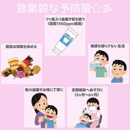水分をしっかりとること、口呼吸を減らすこと、ストレスを溜めすぎないことなども、むし歯予防につながります。